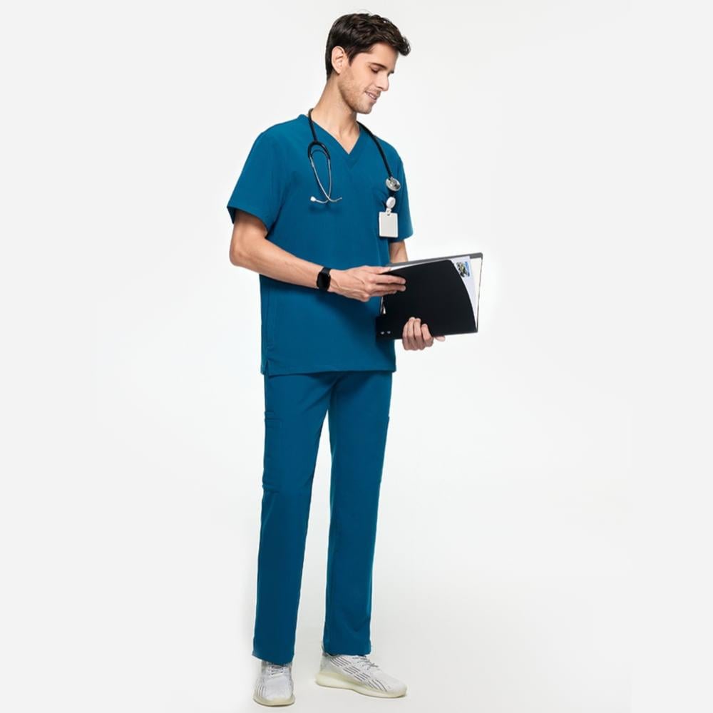 يأتي هذا الطقم الطبي الرجالي بتصميم متوازن يجمع بين البلوزة الطبية برقبة على شكل حرف V والبنطال المستقيم، ليمنحك مظهرًا احترافيًا أنيقًا ومريحًا مثاليًا لساعات العمل الطويلة.